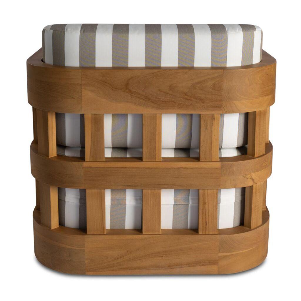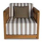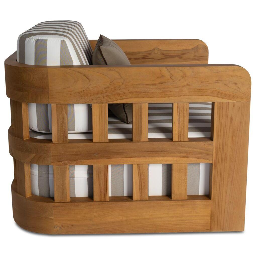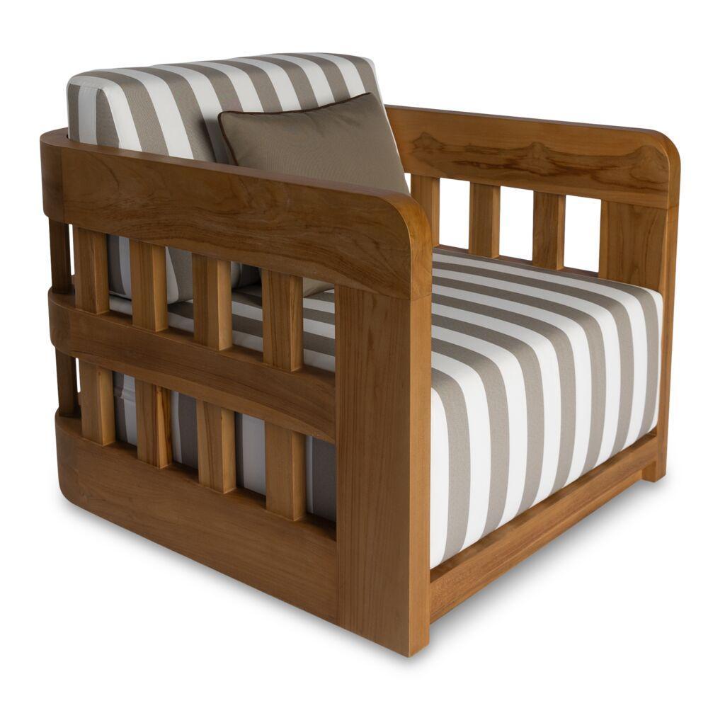 The Adelaide outdoor accent chair infuses the outdoor space with vintage-inspired charm. This contemporary accent chair features a solid teak frame and quick-dry foam cushions upholstered in 100% Olefin fabric. The brown and white striped cushions, accented with a solid tone toss pillow, create visual interest without overwhelming. The curved windowpane detailing nods to vintage designs while maintaining a modern aesthetic.