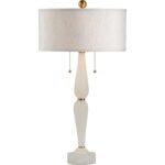Adele lamp is an elegant natural white alabaster and brass 32″ table lamp.Its gracefully curved hourglass silhouette is topped with an off white silkette shallow drum shade for a traditional design with a modern touch. Featuring two lights with pull chains, this accent light is sure to bring beauty and shine to your dining room buffet or formal living room end table.