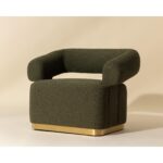 The Aggie Swivel Lounge chair is a statement-making mid-century accent chair with curves in all the right places. Upholstered in milliken cognac faux leather and rhea light barley fabric with a brushed gold stainless steel base, this lounge chair is a beautiful spectacle with its harmonious mix of colours and textures.
