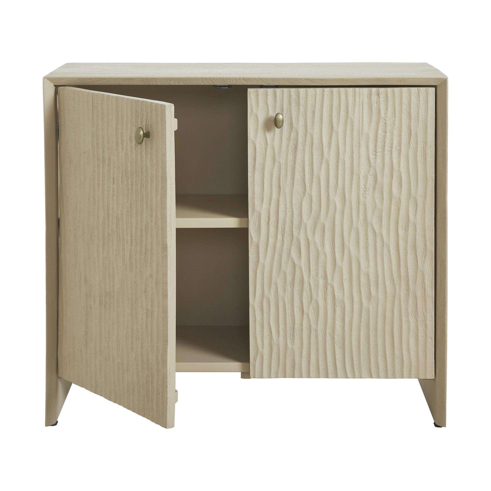 Add effortless function and style with the Aida 2-door cabinet. Its light brown mango wood body, sandblasted texture, and antique brass knobs create subtle elegance, while a clean transitional silhouette offers timeless appeal. Compact yet versatile, it’s perfect anywhere, from entryways to living rooms, blending practical storage with refined, understated charm.