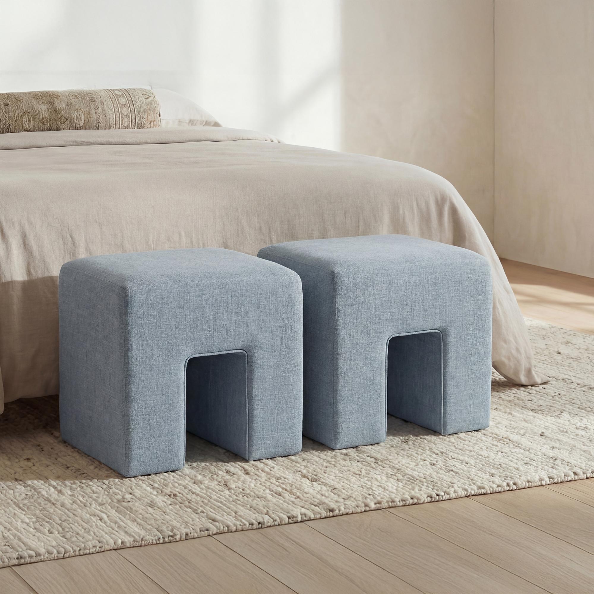 Square never felt so relaxed. The Aidy Stool takes its chunky silhouette and softens it with a linen-blend fabric in light blue that feels airy and easy. The textured weave and slightly wrinkled finish add subtle dimension, while the firm foam seat keeps it grounded and practical. Equal parts playful and polished, this stool is proof that minimal lines can still have plenty of personality.