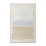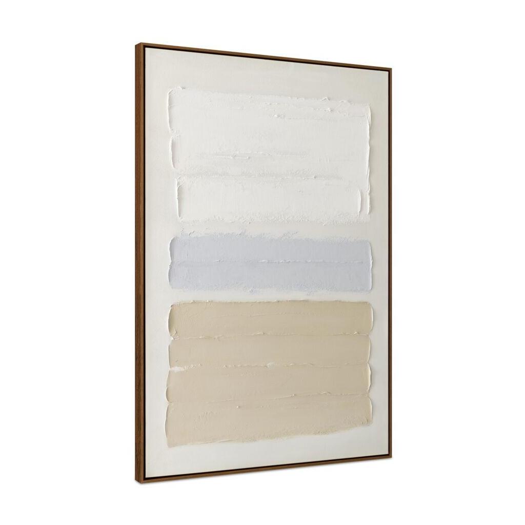 Minimal with movement. Aire captures the quiet rhythm of a space in transition. Simple linear brushstrokes stretch across the canvas in warm beiges and whites, softened by cool notes of blue that bring just enough contrast. The palette is calm; the texture, deliberate. Framed in a clean, modern profile, it adds warmth and flow to a room without ever demanding attention. It’s minimalism, made to breathe.