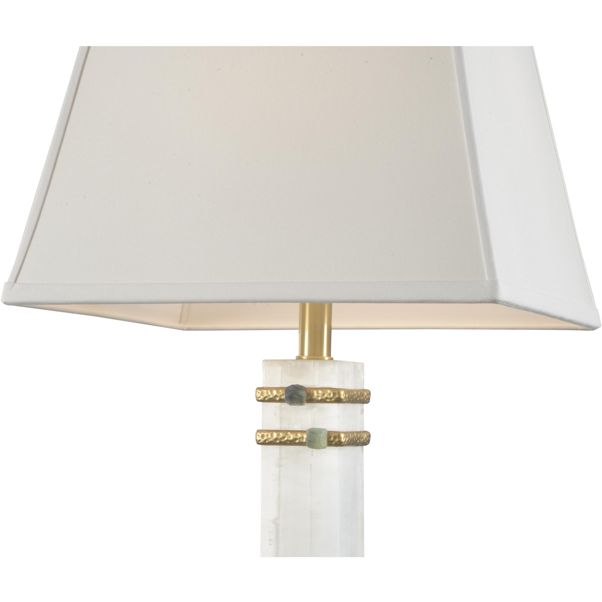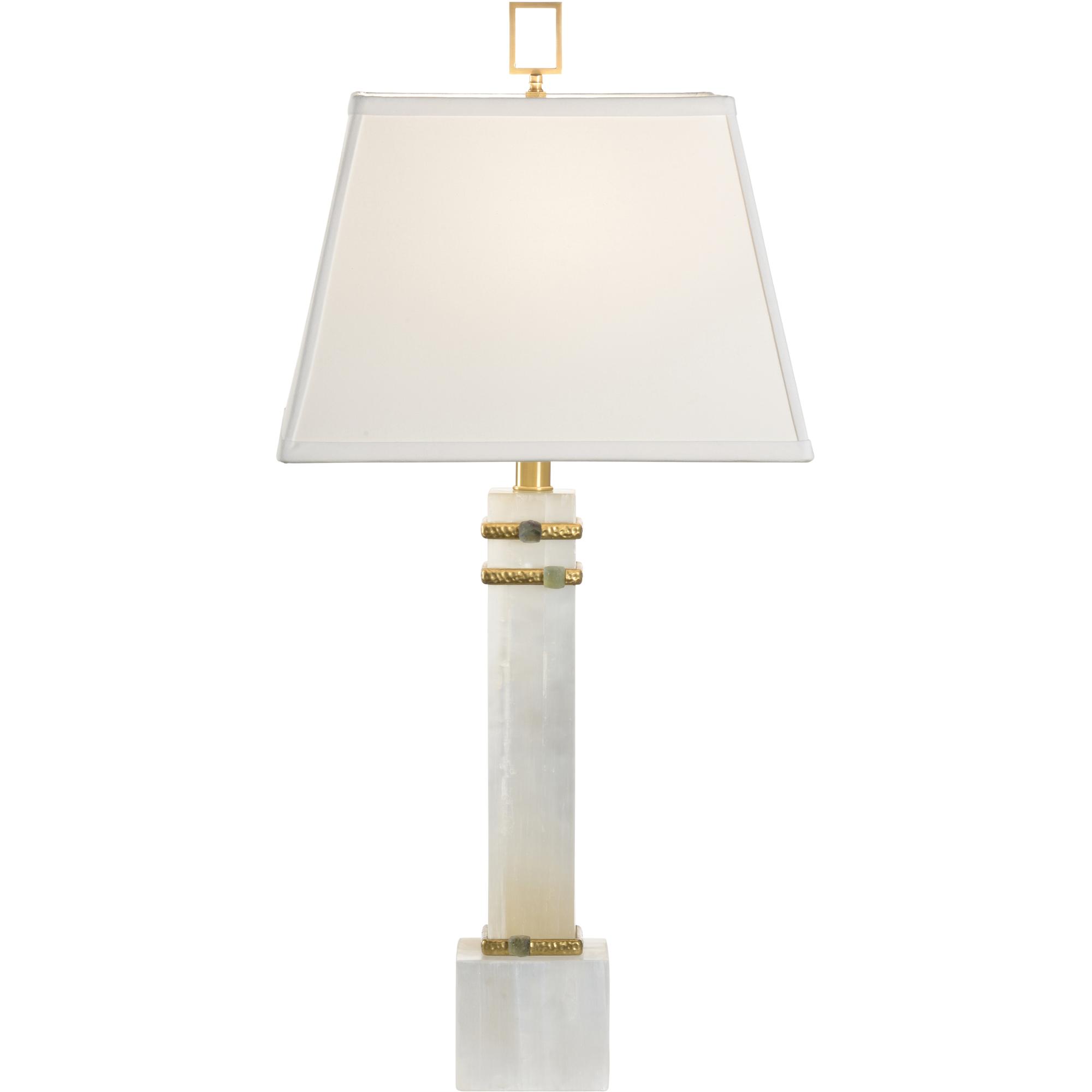 The Alabaster Column Lamp features a stunning design crafted from white alabaster, highlighted by elegant gold leaf cuffs that adorn the column-shaped body. The addition of gold and Jade rings adds a touch of sophistication and visual interest. Finished with exquisite gold leaf detailing and a crisp white fabric shade.