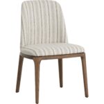 The Alamosa Dining Chair pairs light walnut ash legs with gifford script fabric in soft, linear stripes. Its modern silhouette features a gently curved backrest and tapered legs that bring lightness to the form. Streamlined, versatile, and built for everyday gathering.