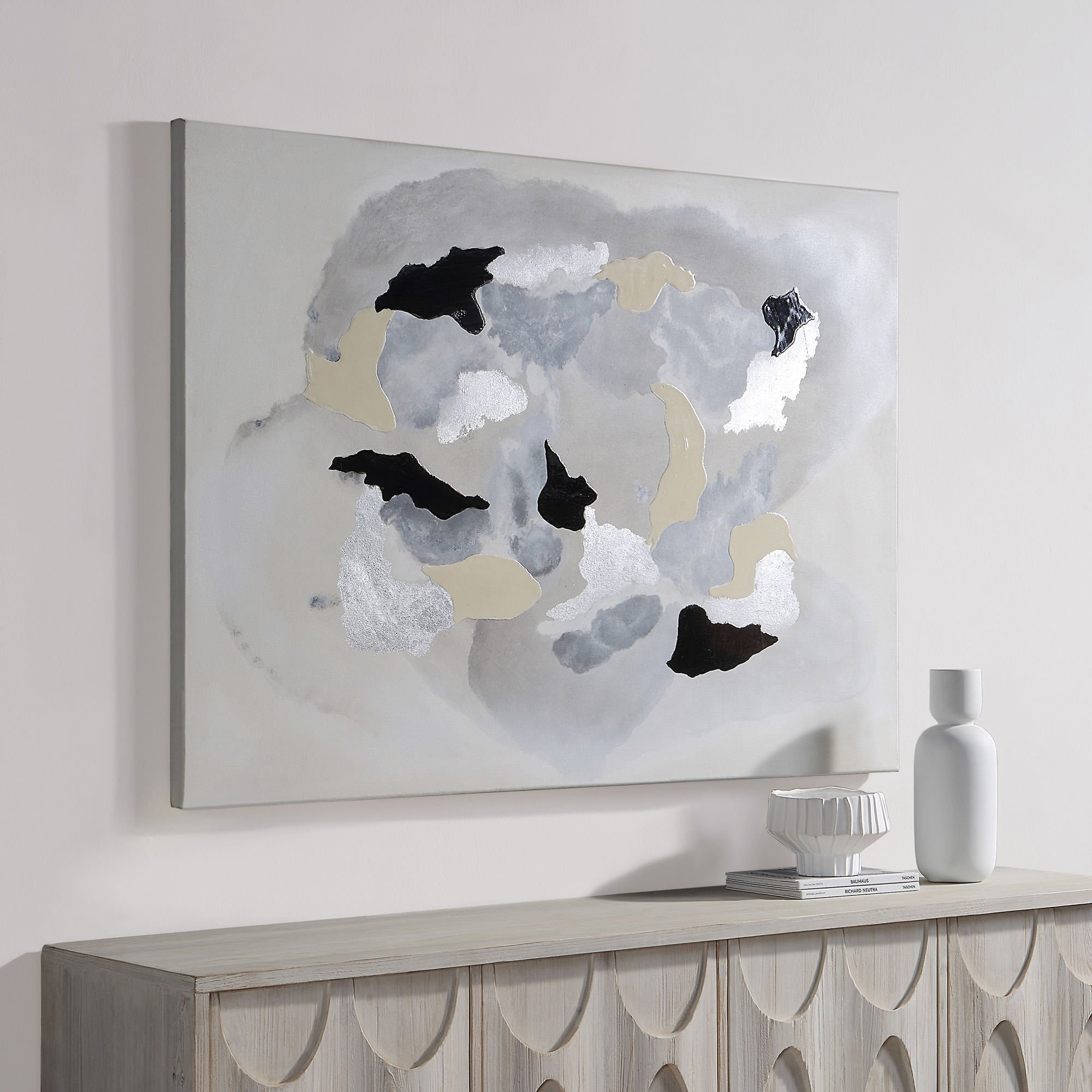 Clients dreaming of creating an ethereal yet modern space in their home or business will find all their needs met in this piece of canvas art. Hanging horizontally or vertically, its abstract shapes and contrasting palette take on a new life at each angle. Best styled with dark, minimalist furnishings and decor, the dark brush strokes on the art painting allow for the living room or bedroom it’s set within to feel cohesive.