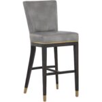 A classically designed barstool with a beautiful antique brass metal inlay for added style. Stocked in bravo metal faux leather with a contrasting polo club stone fabric exterior. Finished with an espresso wood frame with a black metal plate on the footrest to protect from wear and tear. Handle With Care: This design has been crafted with faux leather. Faux leather is manufactured to reflect the natural characteristics of leather; as such, colour variations, markings, wrinkles, grooves, and light scratches are appreciated characteristics. No two pieces will be alike. Visit our Product Care page for more information on how to ensure the lasting beauty of this piece.