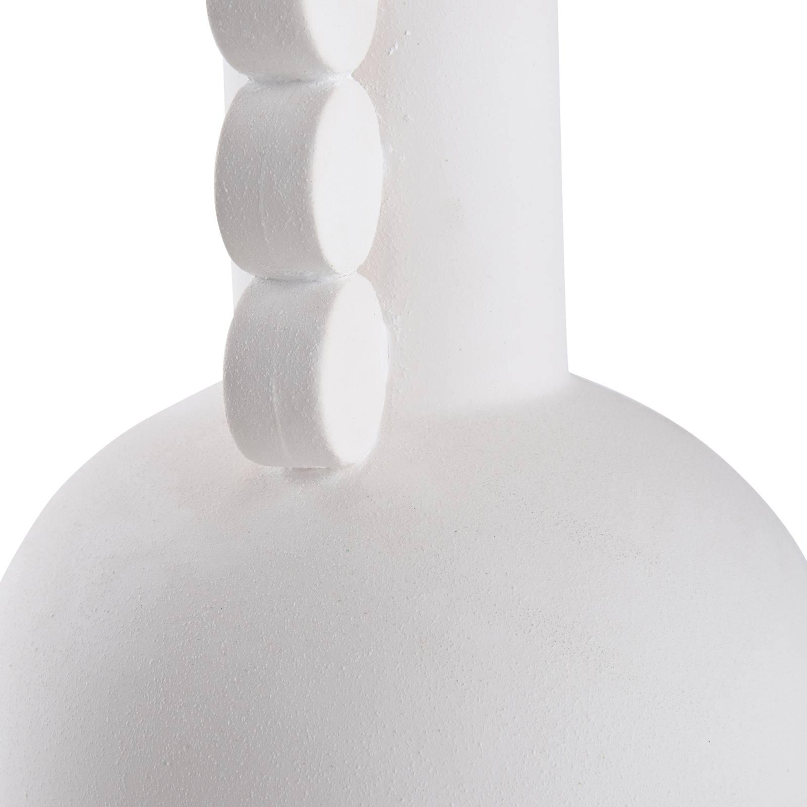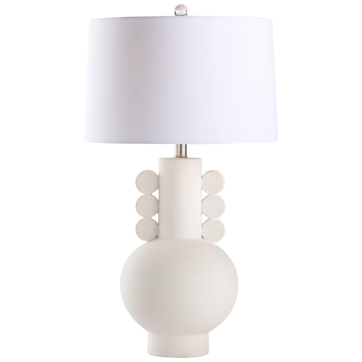 A fresh take on timeless design. This vase-shaped lamp features three sculpted medallions on each side, finished in elegant white with brushed nickel accents and a crystal finial. A beautiful balance of texture and shine for refined spaces.