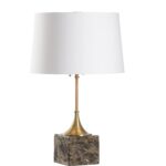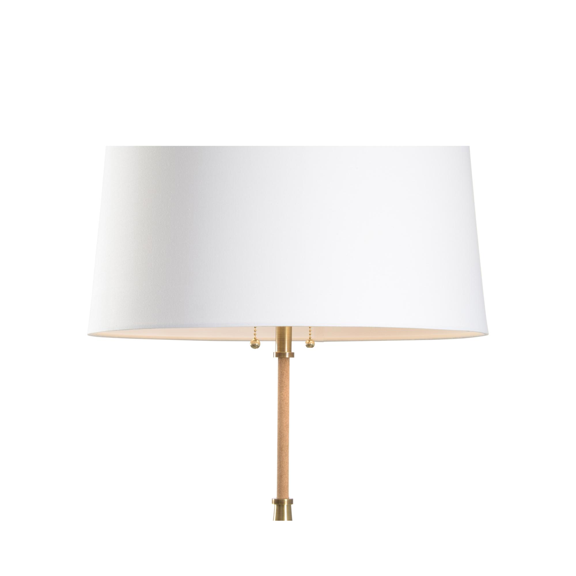 Alsace Table Lamp uses a unique combination of mixed materials to create a striking feature lamp. The antique brass parts are a stunning transition between the chunky, natural brown marble base and slender cork column. Under an off-white, silk shade, two lights with pull chains provide ample lighting throughout any space.