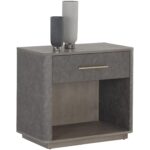 With clean lines and an alluring textured look, the Altman Nightstand reflects a refined expression of shape and form. Designed with a faux leather wrapped frame and one soft closing drawer, a dark grey oak veneer wood top and shelf, and brass stainless steel hardware complete the look.