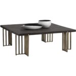 This square coffee table will bring warmth and style to various living and lounge spaces. The distressed oak wood veneer top is complemented with architectural antique brass iron legs for added appeal. Cracks and deep lines in finish are part of the distressed look. Suitable for residential and contract environments.