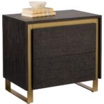 Exuding a refined style, this classic nightstand will add beauty to any bedroom space. Features two push-to-open drawers and crafted with solid oak wood frame with a grey oak veneer frame. Completed with steel legs in a rustic bronze finish. As wood is an organic, porous material, these pieces will contain natural variation of texture and may also exhibit fine indentations and cracks. Wood pieces will also display a disparity of colour and grain, and visible knots and burls that add to the character of each piece.