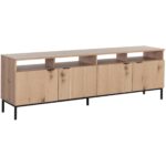 Crafted in Indonesia, this beautiful media console and cabinet will bring modern style and elegance to living, lounge and home office spaces. Designed with cream finished oak wood and a champagne gold iron frame. Features four cabinets for added style and function. Coordinate with the Ambrose modular wall desk, and large and small bookcases for a space saving design. As wood is an organic, porous material, these pieces will contain natural variation of texture and may also exhibit fine indentations and cracks. Wood pieces will also display a disparity of colour and grain, and visible knots and burls that add to the character of each piece.