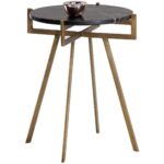 This eye-catching side table exudes a sense of rustic elegance. Features an antique brass iron frame with a round white or black marble top. As marble is a natural material, unique veining, pitting, fissures, micro-cracks and colour variations are all characteristics that add to the uniqueness and beauty of each piece. Made in India. With refined craftsmanship, this design was brought to life by skilled local artisans. By nature, these materials develop unique imperfections such as fissures, markings and colour variations for a truly one-of-a-kind piece.