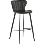 A compact barstool designed with a modern, feminine style. Features clamshell style tufting on the seatback. Stocked in bravo cognac faux leather with a november grey fabric exterior. Finished with black steel legs. A stylish seating option for dining spaces of all sizes. Handle With Care: This design has been crafted with faux leather. Faux leather is manufactured to reflect the natural characteristics of leather; as such, colour variations, markings wrinkles, grooves, and light scratches are appreciated characteristics. No two pieces will be alike.