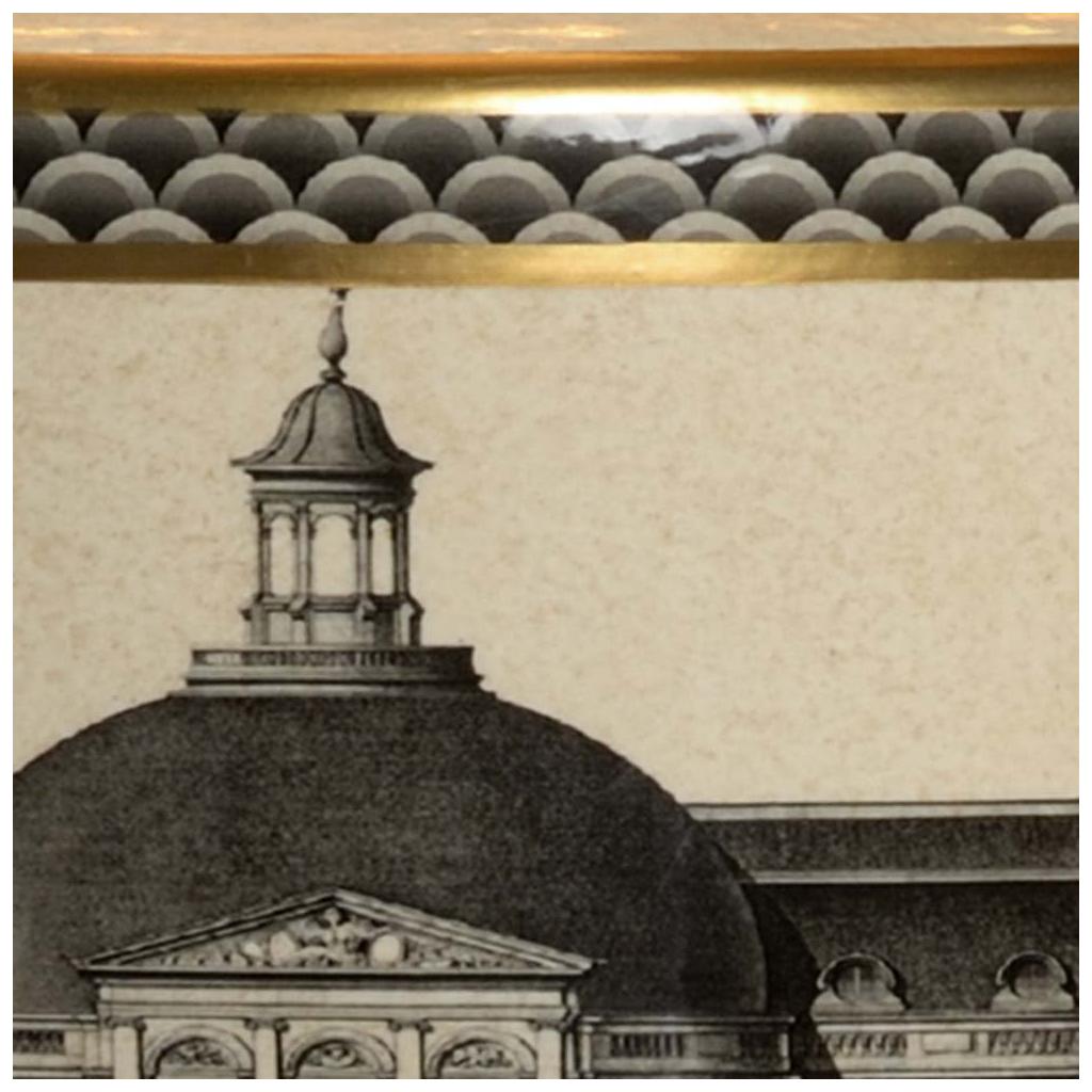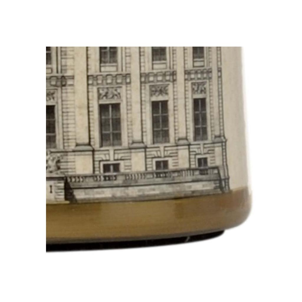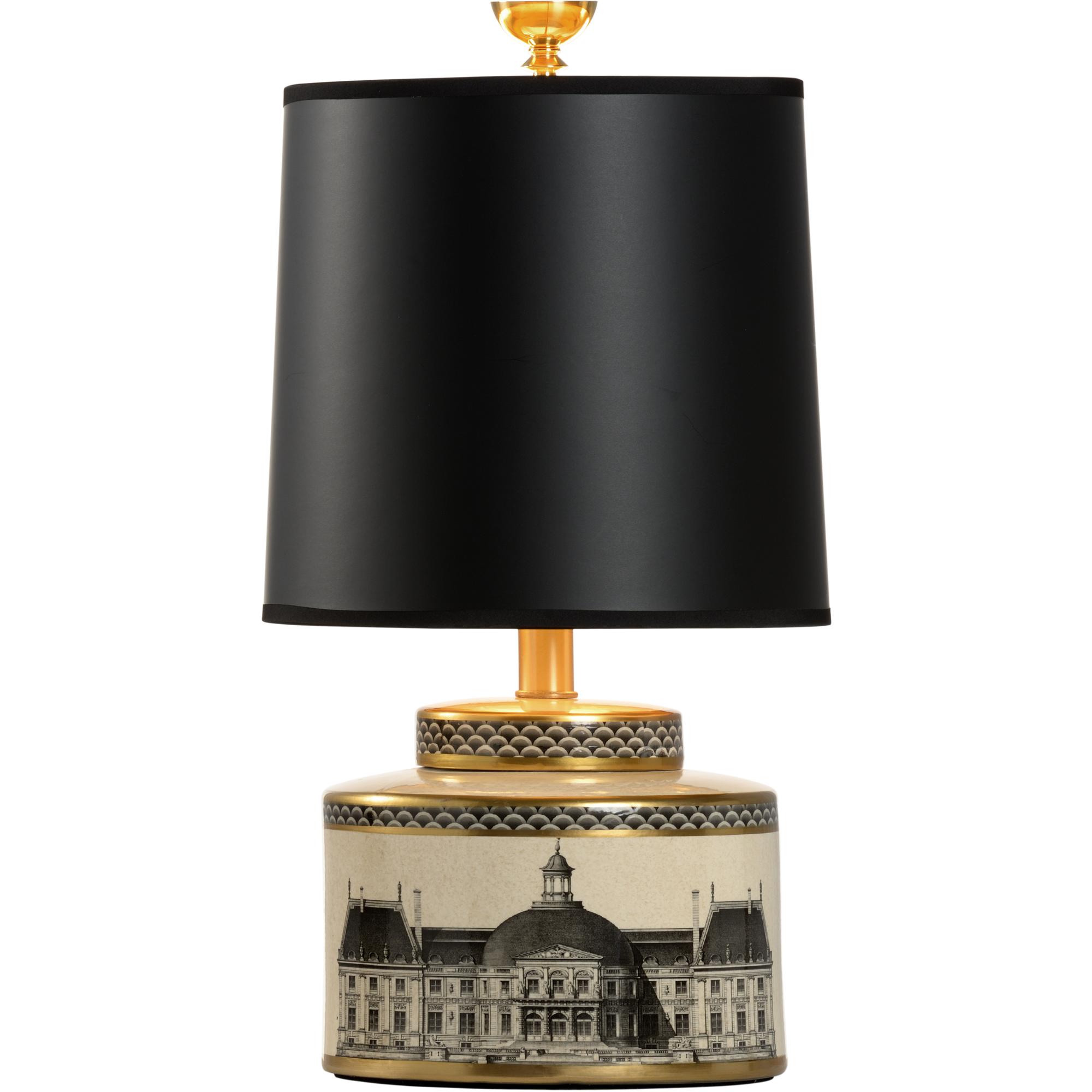 Inspired by architectural tours in European travels, this 19″ table lamp is crafted of a cream glazed ceramic canister with gold trim. The black shade directs light throughout the room while also highlighting the detailed building design. Display in a den, library or home office.