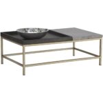 This coffee table is infused with rustic style and minimalist design elements. Features a solid oak wood tray top with an umber brown finish, a grey marble top, and a sleek brushed gold iron frame. Can be paired with matching console and end tables. As marble is a natural material, unique veining, pitting, fissures, micro-cracks and colour variations are all characteristics that add to the uniqueness and beauty of each piece.