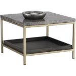 This end table is infused with rustic style and minimalist design elements. Features a grey marble top, a solid oak wood tray shelf with an umber brown finish and a sleek brushed gold iron frame. Can be paired with matching coffee, console and end tables. As marble is a natural material, unique veining, pitting, fissures, micro-cracks and colour variations are all characteristics that add to the uniqueness and beauty of each piece.