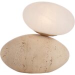The Aruna Lamp – Travertine features a sculptural, travertine base paired with a softly glowing alabaster glass shade. Inspired by natural forms, it brings organic warmth and serene balance to any space.