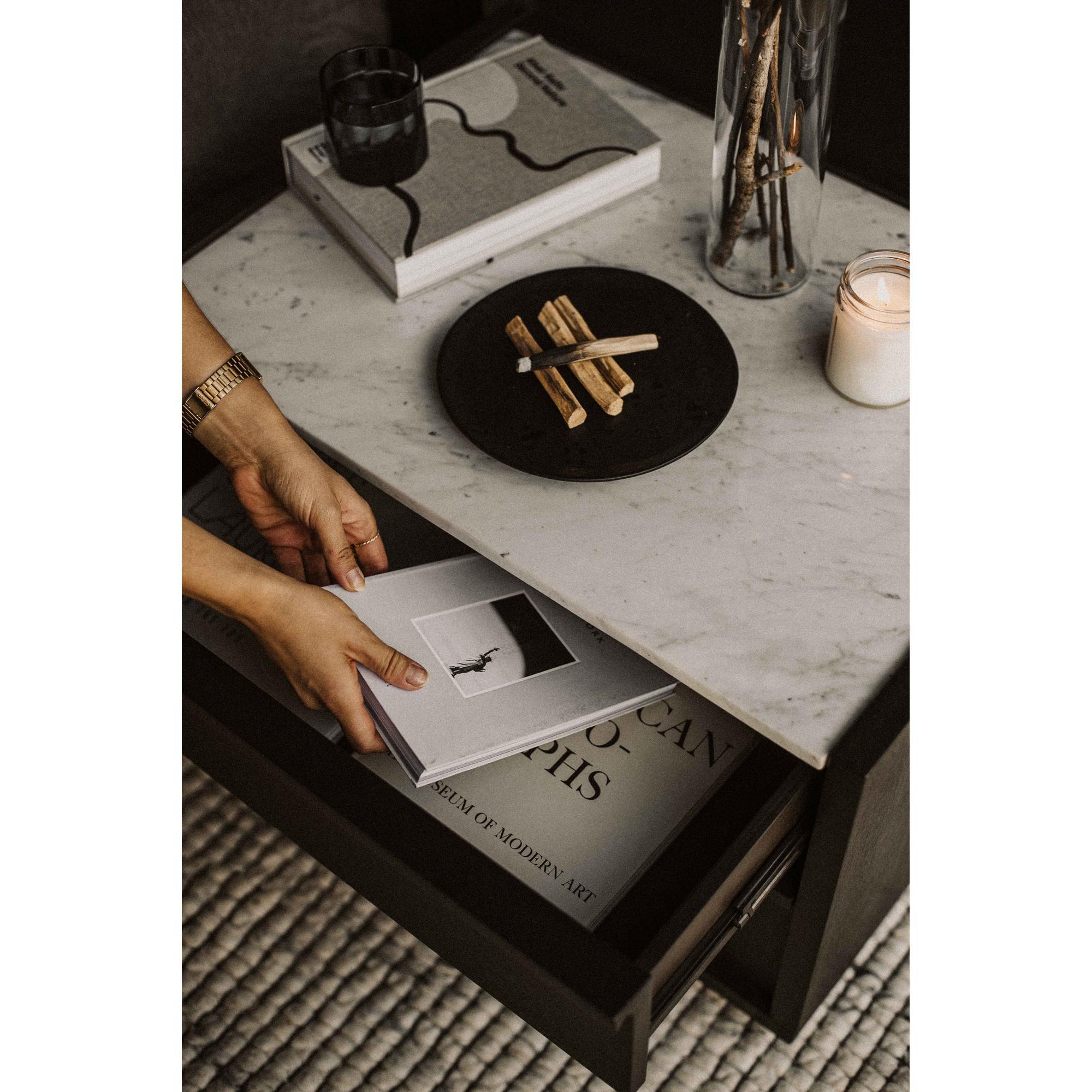 The perfect bedroom companion. A white marble tabletop lies firmly over acacia veneer based drawers. Its two soft-close compartments provide ample space for your bedside needs. It looks best paired with the Ashcroft bed to get that sophisticated aesthetic.