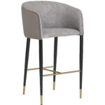 A modern barrel back barstool upholstered in our soft sparrow grey fabric and contrasting napa black faux leather. Finished with black steel legs and brushed gold foot caps. Suitable for various dining, kitchen and bar spaces of all sizes. Handle With Care: This design has been crafted with faux leather. Faux leather is manufactured to reflect the natural characteristics of leather; as such, colour variations, markings wrinkles, grooves, and light scratches are appreciated characteristics. No two pieces will be alike. Visit our Product Care page for more information on how to ensure the lasting beauty of this piece.
