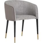 A modern barrel back dining armchair upholstered in our soft sparrow grey fabric and contrasting napa black faux leather. Finished with black steel legs and brushed gold foot caps. Handle With Care: This design has been crafted with faux leather. Faux leather is manufactured to reflect the natural characteristics of leather; as such, colour variations, markings wrinkles, grooves, and light scratches are appreciated characteristics. No two pieces will be alike.