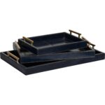 Set of three midnight blue leather trays with distinctive gold handles. Use them together or seperatley, a handsome addition to any living spaces. Medium-3″h x 18 1/2w x 12 1/4″d, small-3″h x 14″wx 101/4″d.