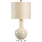 This modern single gourd lamp is a versatile light source for any design style. It features a cream glazed ceramic body and square acrylic base. A cream linen drum shade and brass ball finial finalizes this contemporary design that will blend effortlessly in any room.