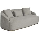 The beautiful lines of this sofa will make a bold and comfortable statement in any space. Features a curved seatback with channel tufting in velvet merlot fabric. Finished with an antique brass iron frame. Three cushions included.