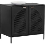 A timeless nightstand with a steamlined composition. Crafted with a black metal frame and completed with brass handles. Features open shelving and two cabinets with an arched perforated metal design. Pairs well with the Aziza media console and cabinet and sideboard. Made in India. With refined craftsmanship, this design was brought to life by skilled local artisans. By nature, these materials develop unique imperfections such as markings and colour variations for a truly one-of-a-kind piece.
