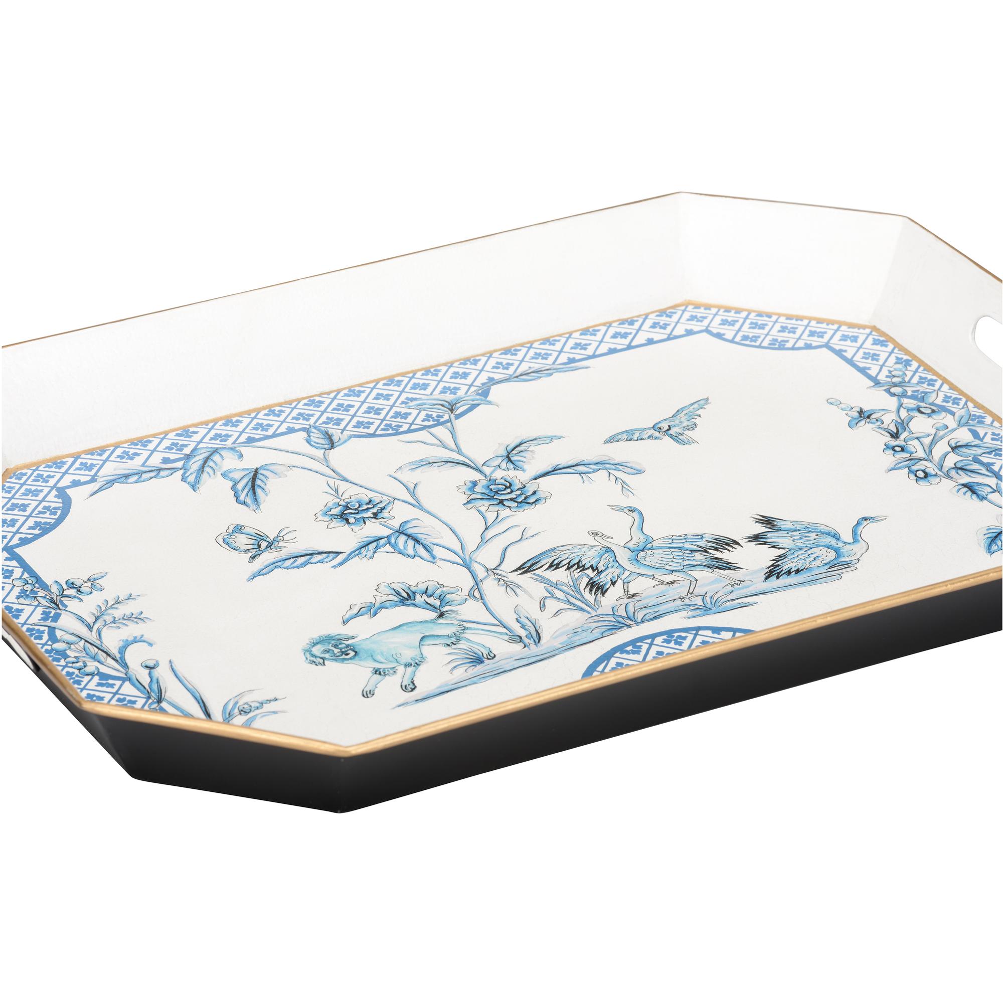 The Bagatelle Tray II is a beautifully crafted piece, featuring a hand-painted blue and white scene on its durable metal surface. Inspired by classic porcelain patterns, the intricate artwork brings a touch of timeless elegance to your home. Both functional and decorative, this tray is perfect for serving drinks, displaying decor, or as a stylish accent on coffee tables and countertops.
