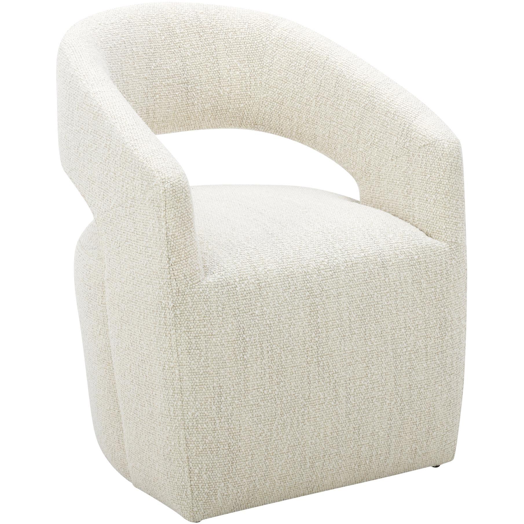 Dinner’s ready, and Barrow is rolling in. A curved barrel back wraps you in living-room comfort, so lingering feels like part of the plan. Upholstered in White Mist NeverFear™ performance boucle, it brings texture with an easy-care mindset. Inside, a solid wood and plywood frame supports feathers, high-density foam, and poly-fill. Add a swivel base and hidden casters, and every toast, refill, and chat stays effortless. Pull up, then glide back without leaving a mark.