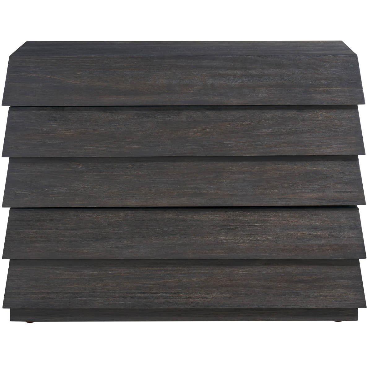The Basalt Chest commands attention with its dramatic Basalt finish and striking lap-siding detail. Its tiered, waterfall-edge drawers offer a unique design element while providing ample storage. This chest serves as a bold statement piece, adding a touch of modern architectural flair to any room.