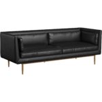 Inspire conversation while seated in this bold sofa. Streamlined and refined, this design features a seat in bravo black faux leather with channel tufting on the exterior. Sleek piping and a bronze steel base complete the look. Includes four cushions. Coordinating armchair also available. Handle With Care: This design has been crafted with faux leather. Faux leather is manufactured to reflect the natural characteristics of leather; as such, colour variations, markings, wrinkles, grooves, and light scratches are appreciated characteristics. No two pieces will be alike. Visit our Product Care page for more information on how to ensure the lasting beauty of this piece.