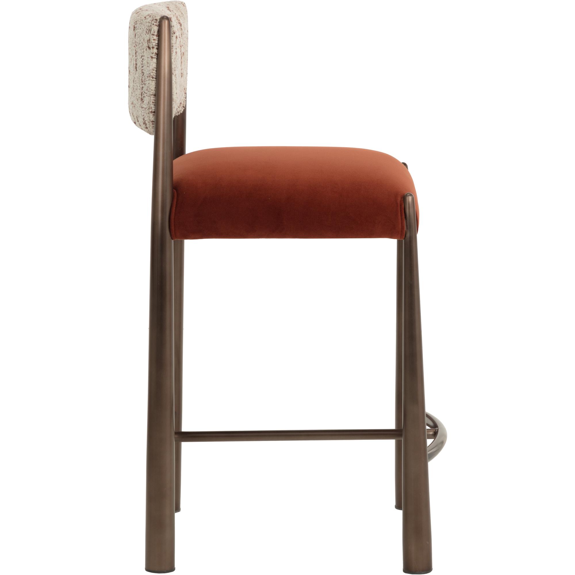 The Bayard Counter Stool pairs textural contrast with clean geometry. The tactile weave of terri nutmeg fabric on the backrest complements the smooth meg rust fabric on the wood seat frame. The two-tone upholstery, along with its elegant dark bronze metal legs, create visual interest that elevates any space.