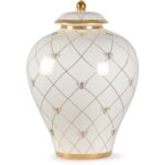 A countertop version of a ginger jar offering a vibrant color palette with metallic satin gold detailing. Designed by Shayla Copas.