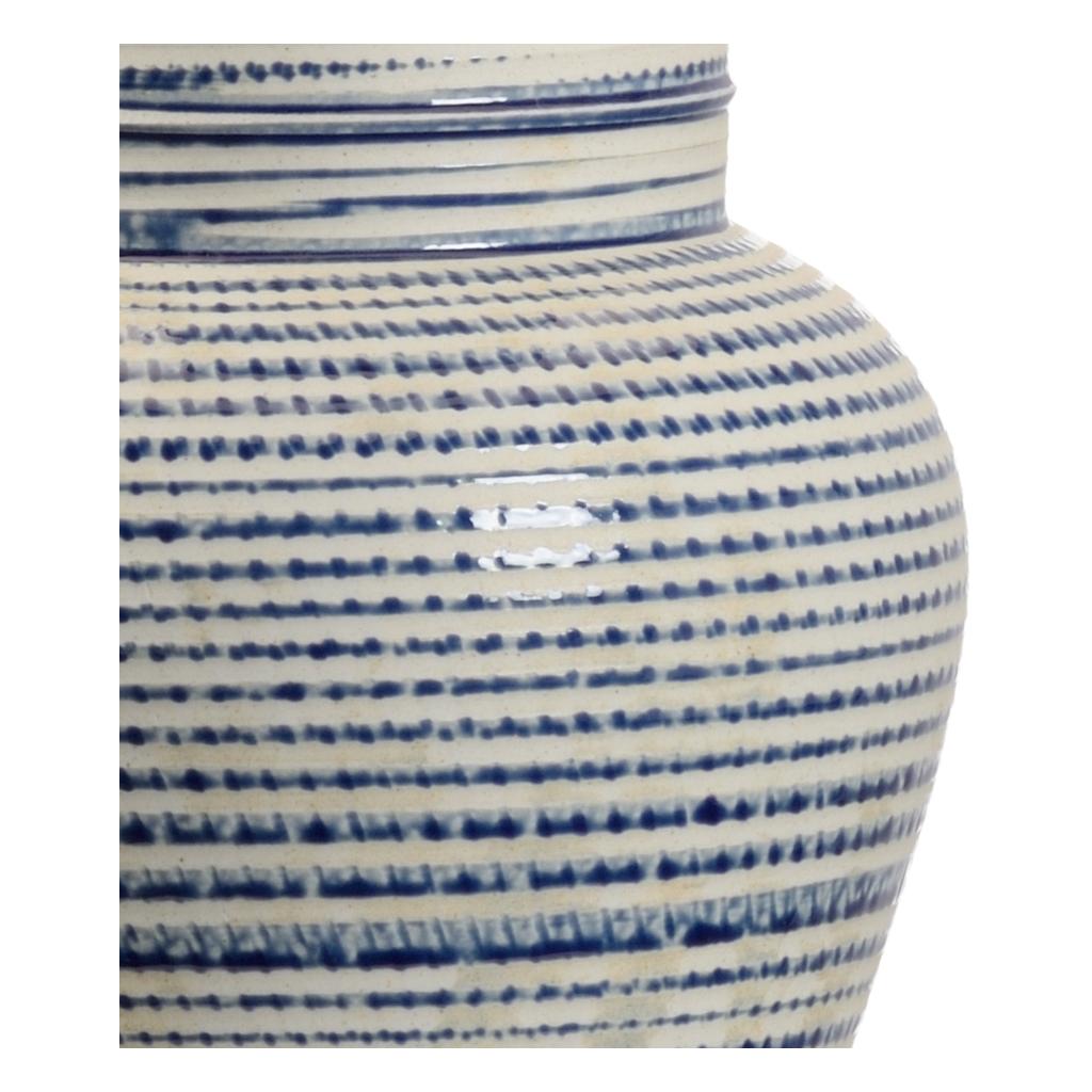 Handmade ceramic urn in blue and white glaze with an antique brass mounting.