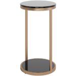 This end table features tempered black glass on an antique brass steel base. Perfect for compact spaces in both transitional and modern environments.