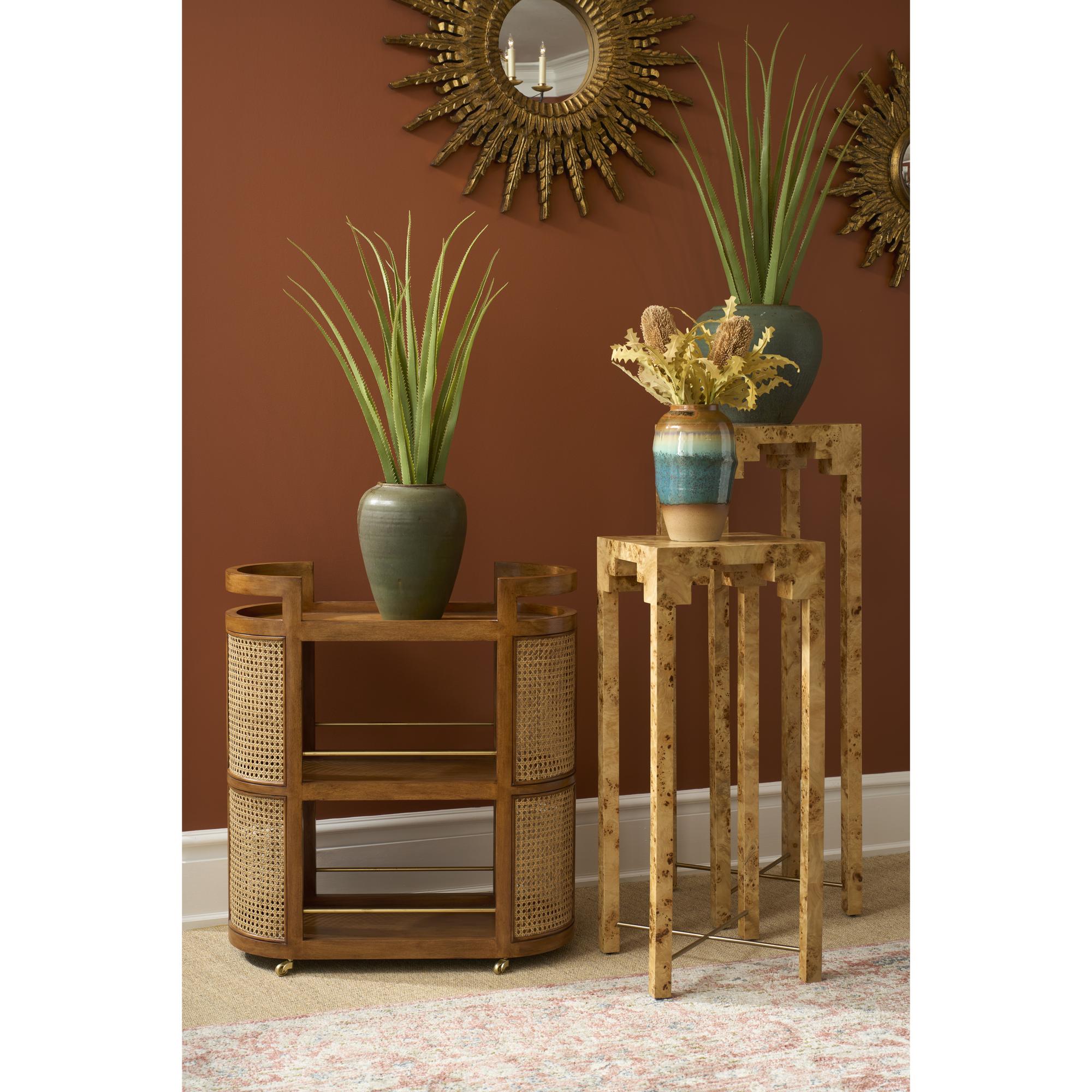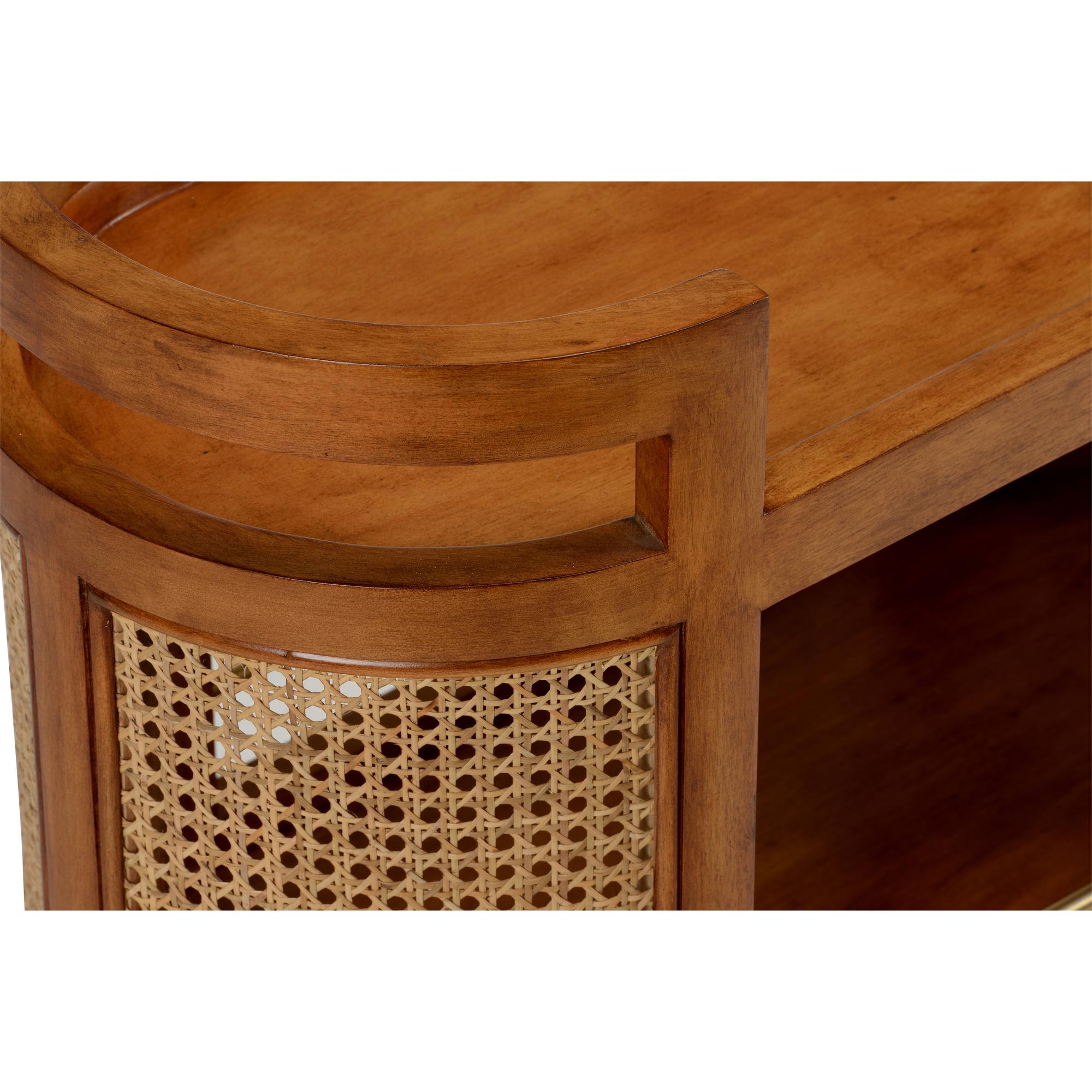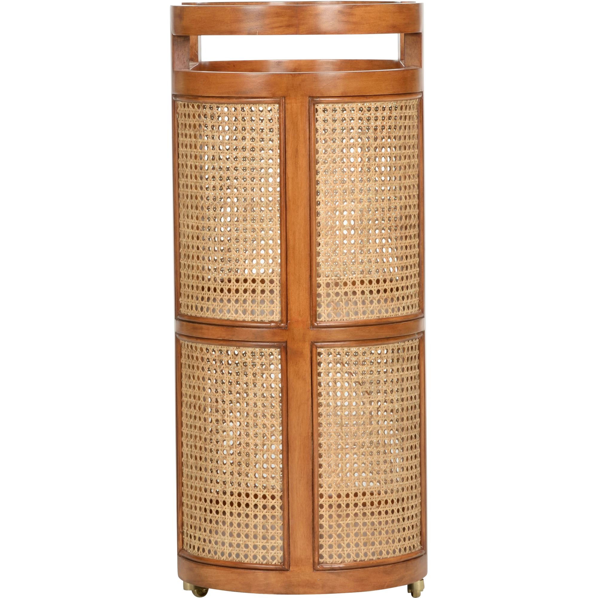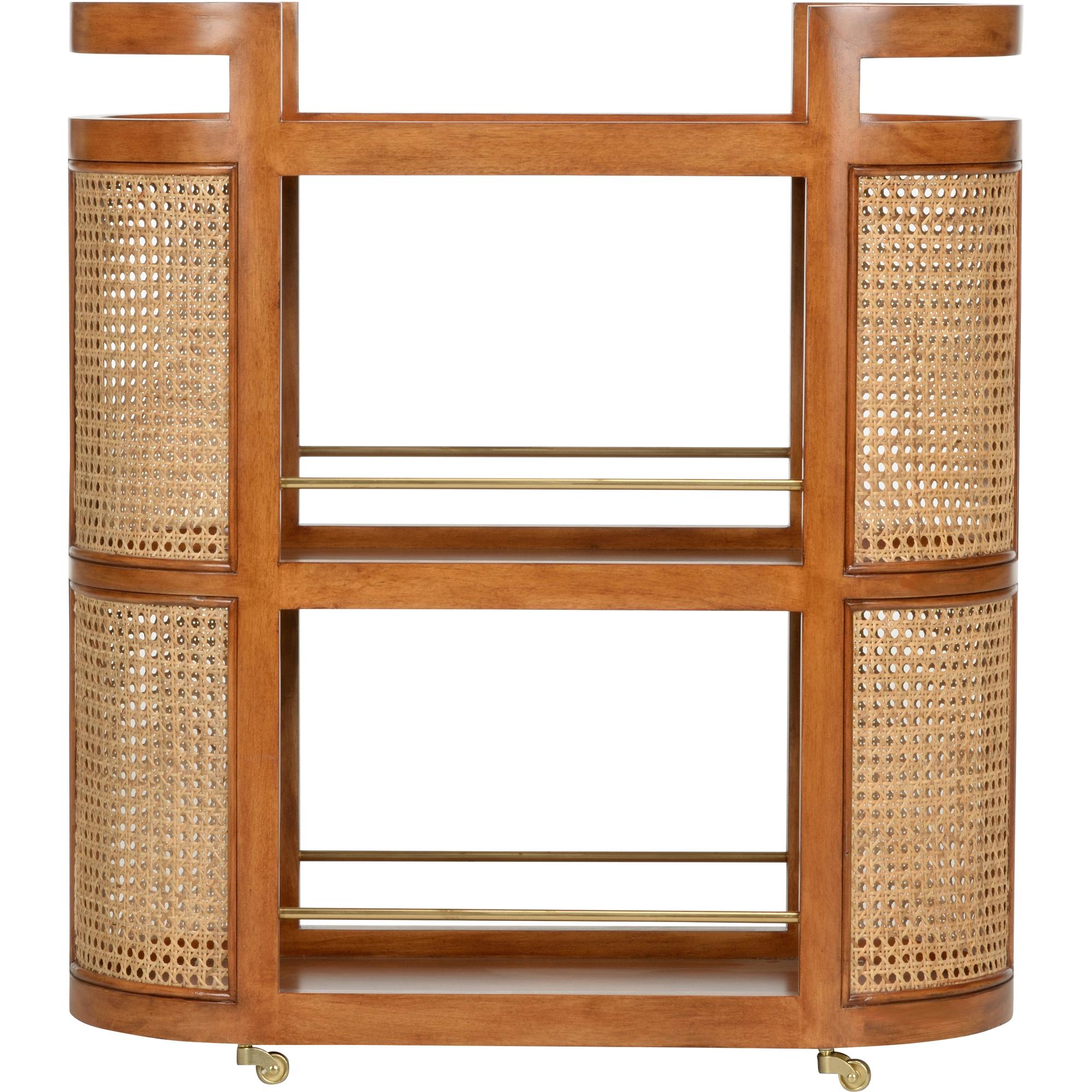 The Berkshire Bar Cart features a sleek maple veneer construction that adds a touch of sophistication to any room. Adding a touch of texture and visual interest, the sides of the bar cart are adorned with cane siding. The rich tones and smooth finish of the veneer provide a beautiful backdrop for showcasing your favorite beverages and barware.