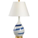 Add movement and beauty to your home with the Blue Swirl Lamp. Featuring a curved silhouette with an elongated neck, this white glazed porcelain vase has a hand painted blue swirl brushstroke. The base and finial are finished in antique gold leaf. An off white tapered linen shade helps to achieve a transitional design pefect for a bedroom nightstand or dresser.