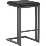 A modern industrial stool featuring a backless seat in onyx faux leather and a cantilever frame with footrest in grey powder-coated steel. Designed for residential and commercial environments. Suitable for various dining, kitchen and bar spaces of all sizes.