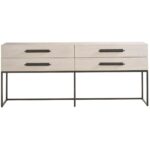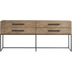 The Boulder Metal Base Console blends industrial chic with natural warmth. Featuring a sleek metal base and a warm Boulder medium-brown finish, its clean lines and four spacious drawers offer both style and functionality. This console adds a modern, architectural touch to your entryway, living room, or dining area, perfect for those seeking a blend of contemporary design and practical storage.