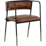 Simplicity is key with this effortlessly elegant dining armchair that features a curved backrest. Stocked in bravo cognac and admiral faux leathers, and completed with black iron legs with antique brass tips. Handle With Care: This design has been crafted with faux leather. Faux leather is manufactured to reflect the natural characteristics of leather; as such, colour variations, markings, wrinkles, grooves, and light scratches are appreciated characteristics. No two pieces will be alike.