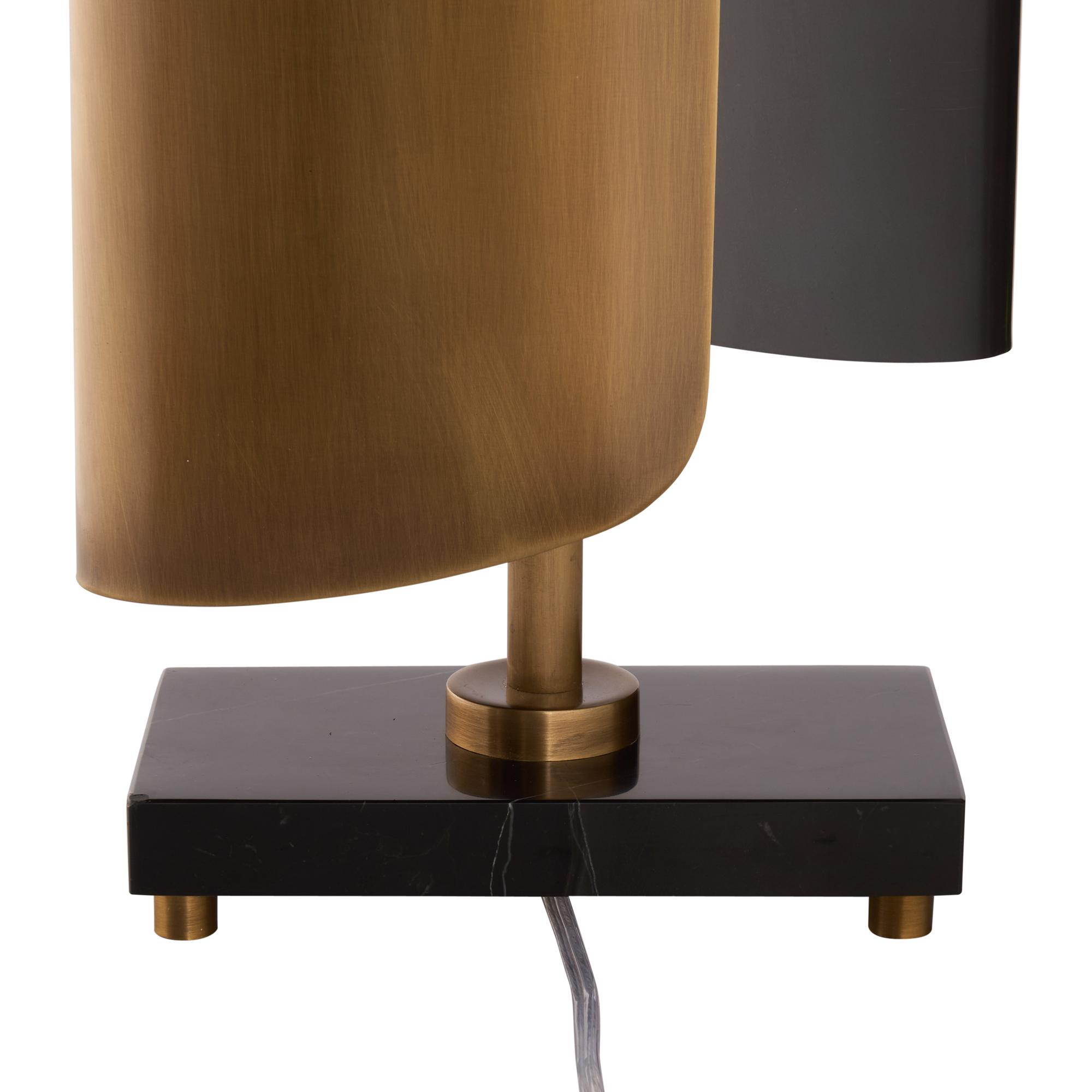 The Brentwood Lamp showcases sculptural metal panels in an antique brass and bronze finish, anchored by a black marble base. A striking blend of form and contrast, it adds bold sophistication to any space.