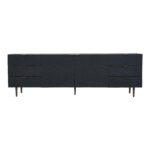 A distinguished silhouette for the dining room. Cutting a suave profile in black and gold, Breu’s textured front façade features relief carving that adds an elegant, sculptural quality. Solid oak construction offers natural touches, while six drawers with side mounted, soft-close door glides, and two large cabinets with adjustable shelves provide storage for all your dining accessories. Slender, understated legs and gold-finished handles are the finishing touches on this dusky dinnertime affair.