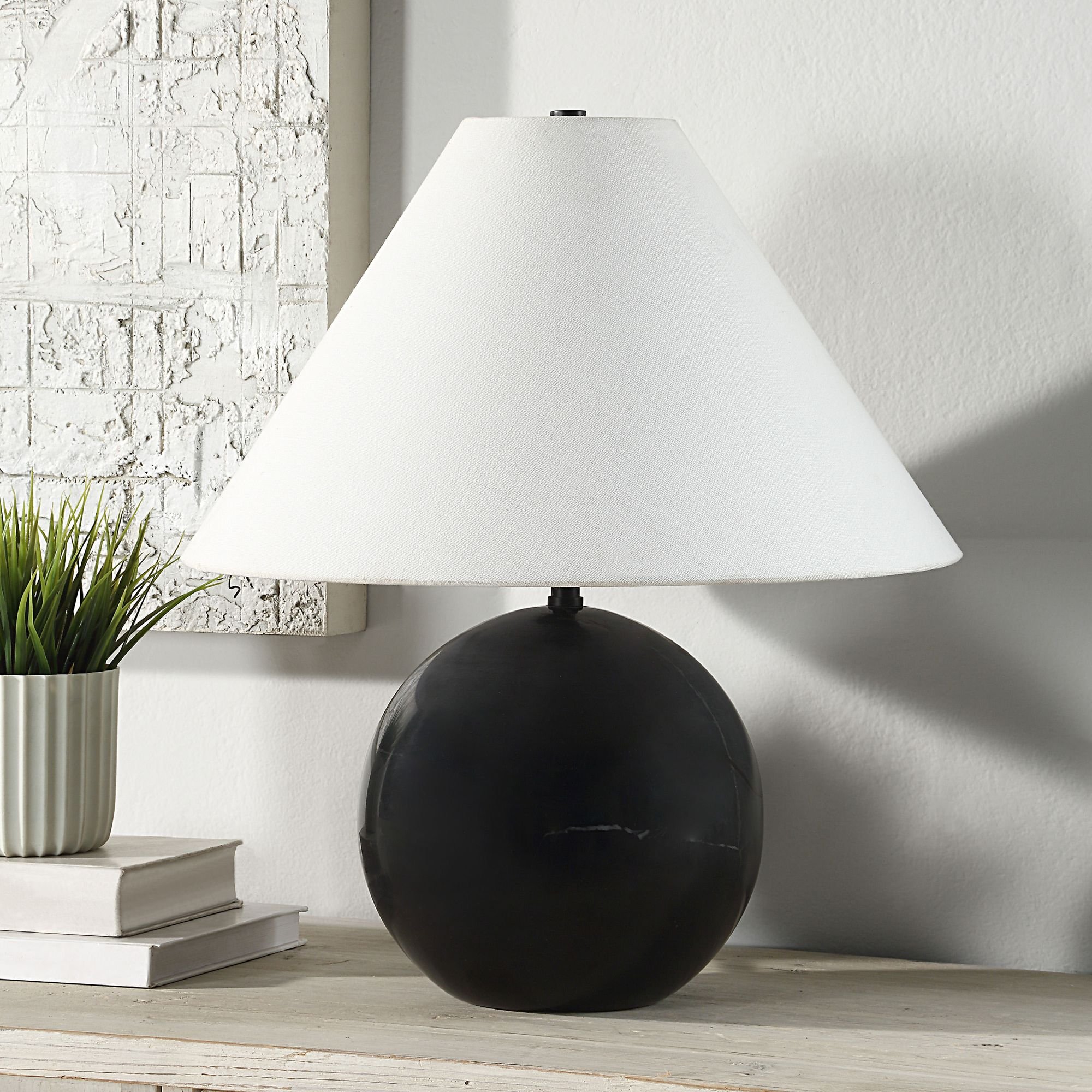 The Brienne table lamp is set to become the fashionable sidekick your room update has been waiting for. Blending form and function, it features a stunning honed marble base in tones of black that complements many styles of interior. The perfect bedroom or living room table lamp, its generously sized tapered cream linen shade is held up by a matte black fitting that when combined with its included bulb, shed a warm glow throughout the room. Beautiful on its own or paired up for double duty, this dimmable lamp will make a timeless and memorable statement in any space.