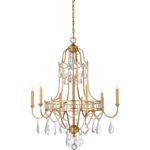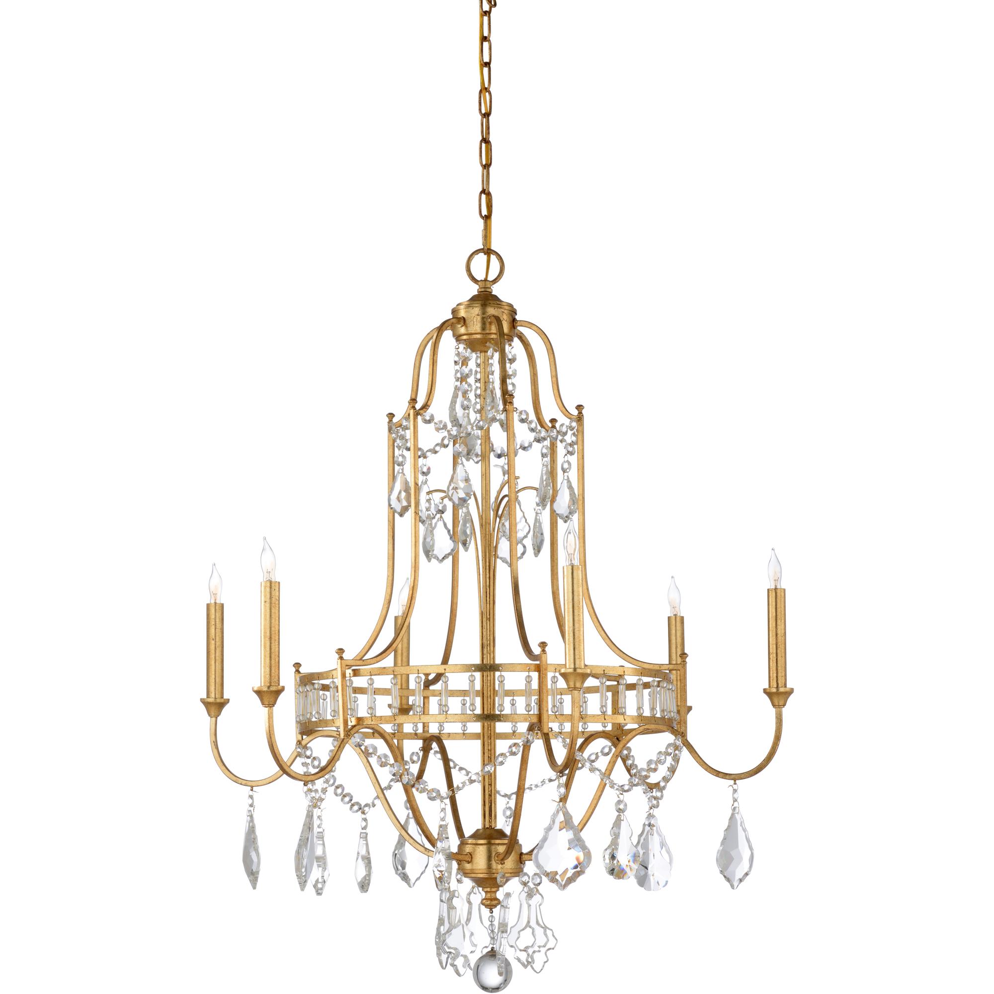 Antique gold leaf finish on iron with clear crystals. Six lights. Comes with 9 feet of chain.