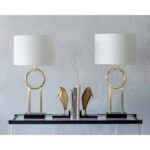 A sculptural set of two table lamps adds style to the contemporary living room. The antique brass plated iron structures feature geometric appeal and are grounded by black bases. The off-white cotton drum shade gives the lamps an elevated status.