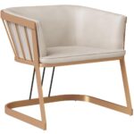 Elegant and modern style unite in this beautiful lounge chair. Stocked in bravo cream faux leather with a brushed gold stainless steel cage-like, cantilever frame. Contrast black steel legs complete the look. Handle With Care: This design has been crafted with faux leather. Faux leather is manufactured to reflect the natural characteristics of leather; as such, colour variations, markings wrinkles, grooves, and light scratches are appreciated characteristics. No two pieces will be alike.