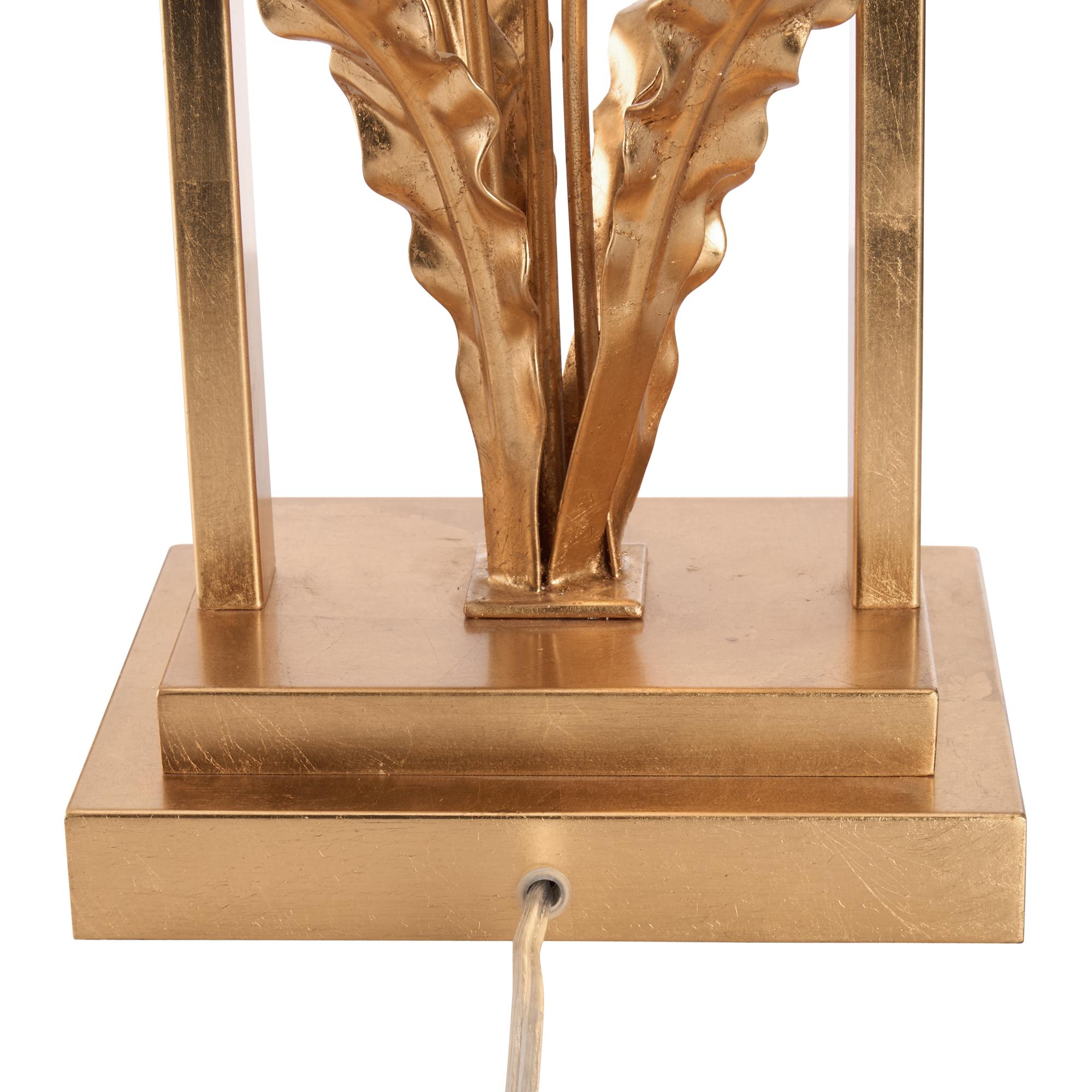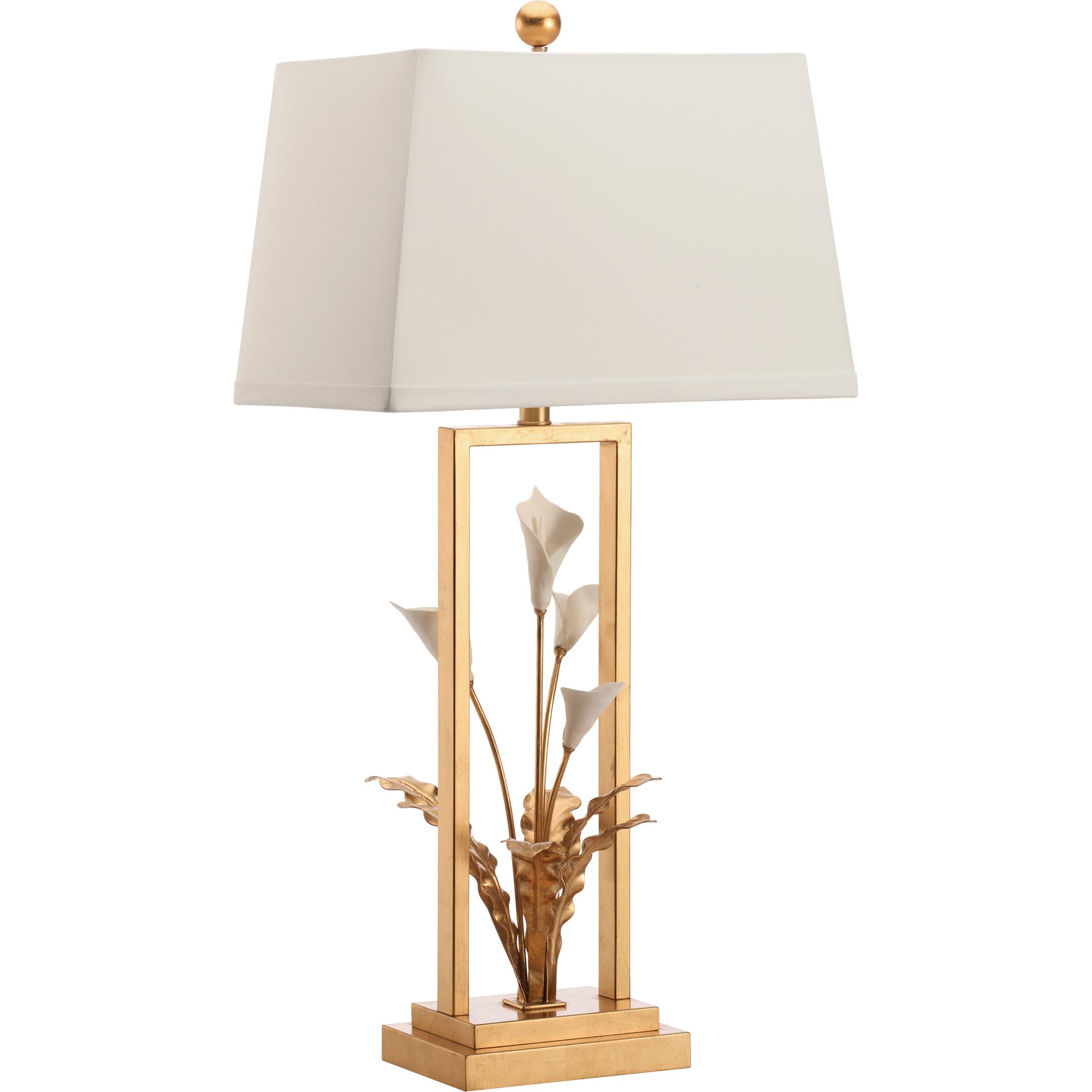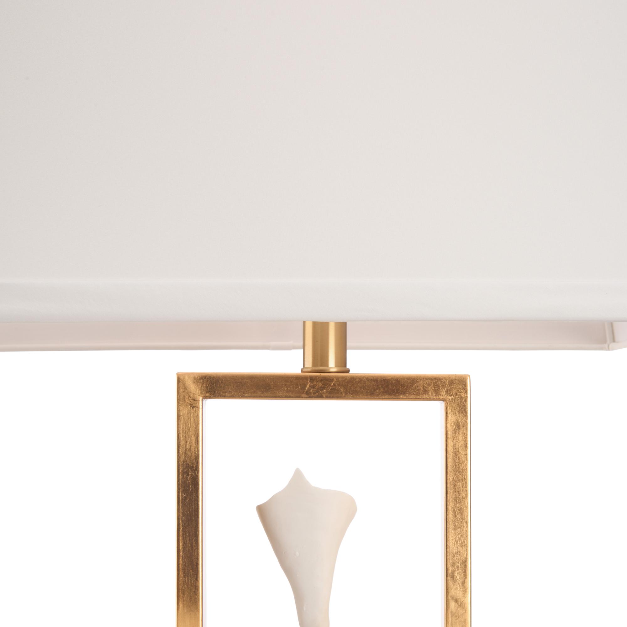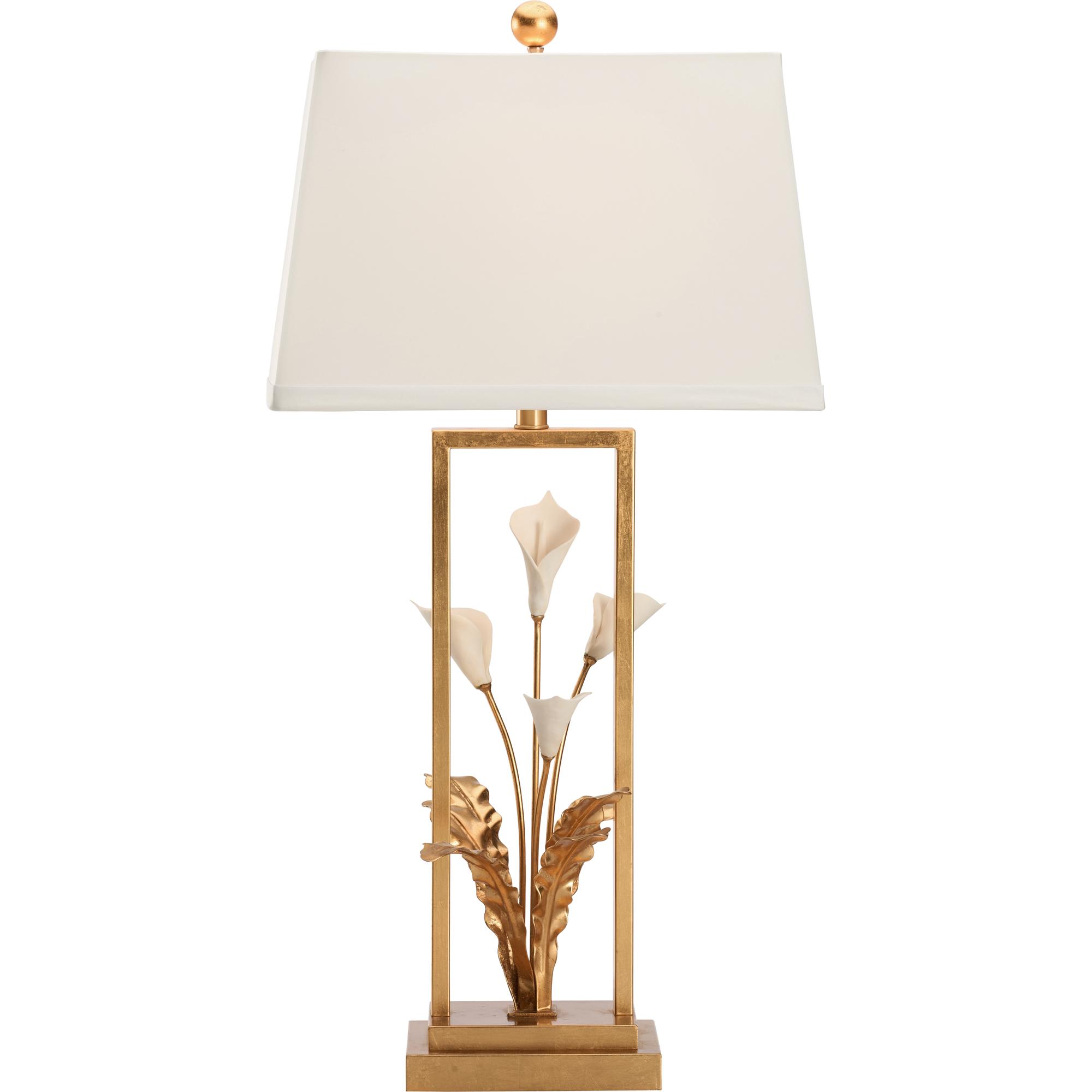 This elegant lamp showcases a delicate porcelain Calla Lily perched on a gold stem with sculpted leaves, all encased in a graceful gold border, blending floral beauty with refined sophistication. Designed by Bill Cain.