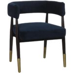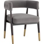 Invite guests to relax in this elegant open back armchair. Features a modern barrelback seat in antonio charcoal performance fabric with ruching on the exterior. An exposed brown birchwood frame with gold metal caps completes the look. Perfect for living, lounge and office spaces. Performance fabric is moisture repellent, durable and easy to clean.